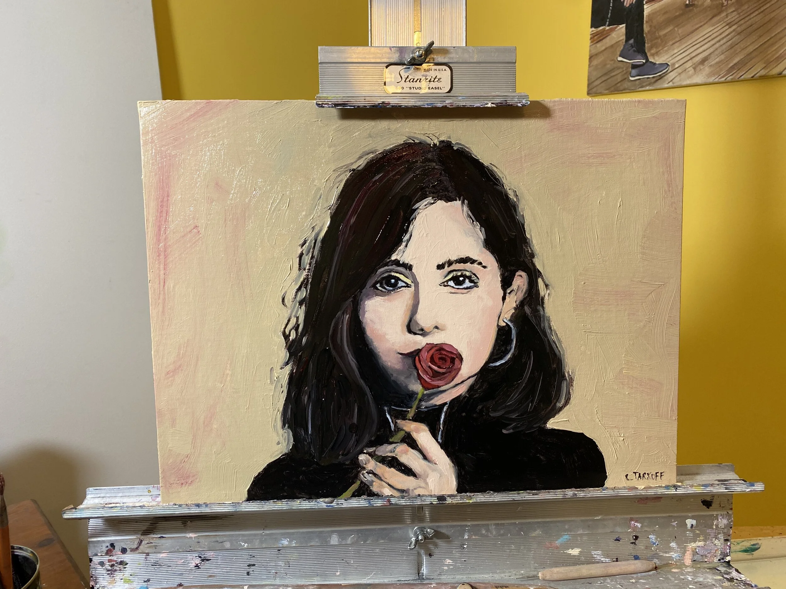 Tori holds some kind of yellow flower in her inspiration photo, but I knew the yellow flower did not hold as much power and impact as a single red rose. I believe painting Tori with a red rose helped me with the psychology of the painting. While painting I could feel her quiet silence, which for me, is the true subject of the painting.